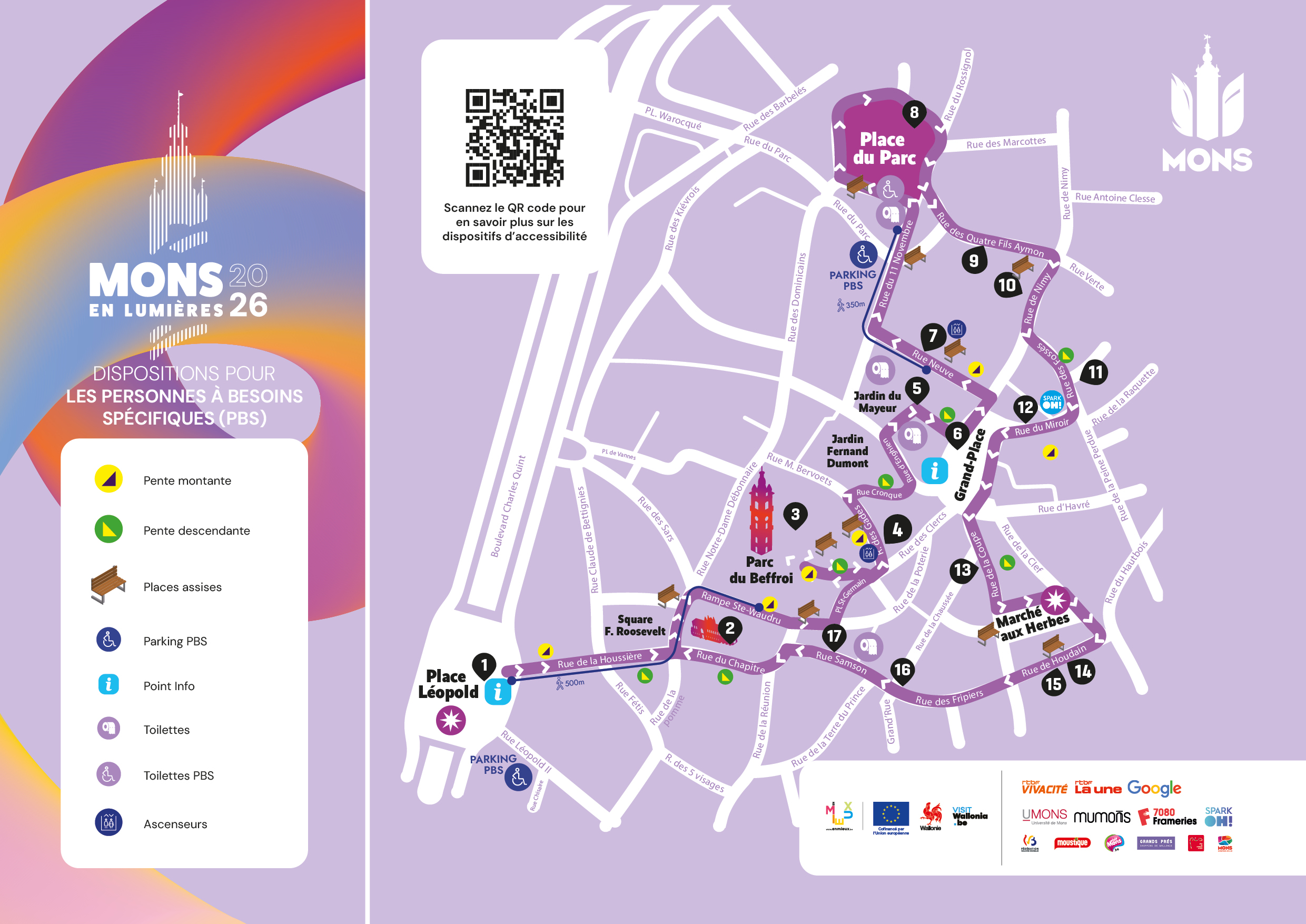 - Sanitaires adaptés : WC accessibles au Jardin du Mayeur, à la Place du Parc et au Beffroi.