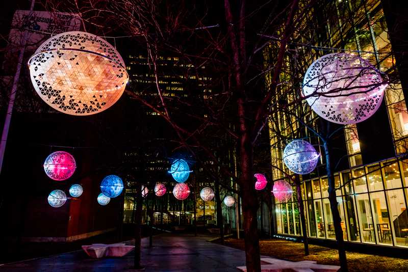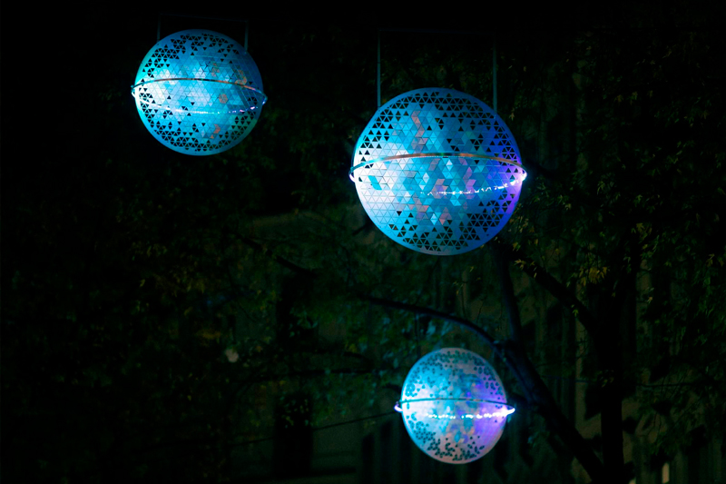 Look up  ! Explore this luminous sky brought to life by fourteen hand‑sculpted light spheres. This poetic cosmos at the heart of the city reflects light in motion and creates the illusion of three‑dimensional objects. Between poetry and contemplation, the installation transforms the street into a surreal and immersive universe.