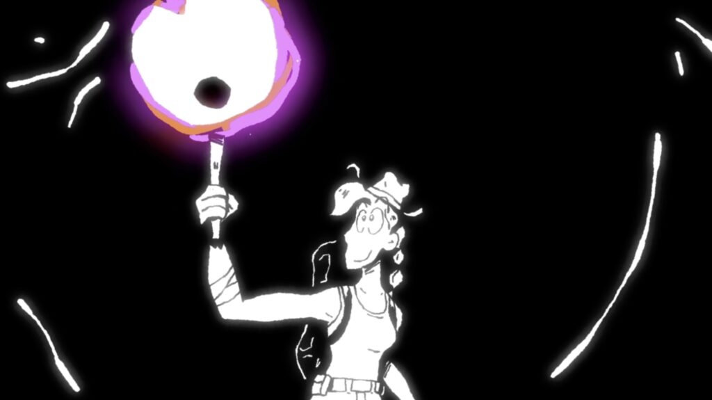 La première œuvre, Chroniques de Lumière, est une animation entièrement dessinée à la main, image par image. Elle vous propose un voyage à travers l’histoire de l’humanité. Tout commence dans une grotte, avec des hommes préhistoriques frappant un silex pour produire une étincelle : un moment fondateur, où l’être humain cesse de dépendre uniquement du ciel pour s’éclairer et commence à créer sa propre lumière. À partir de là, le temps s’accélère.