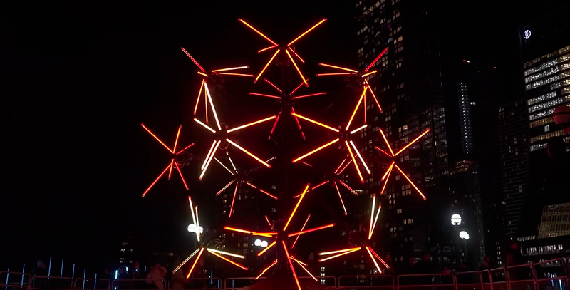 « Neuron » haalt inspiratie uit de fascinerende wereld van neuronen en hersenverbindingen. Doorschijnende structuren met LEDs en lichtdraden reageren dankzij sensoren op beweging. De installatie wordt een levend organisme dat het innerlijke licht van onze geest onthult. Door wetenschap en poëzie te combineren, nodigt « Neuron » ons uit om onze eigen gedachtenflitsen te verkennen.